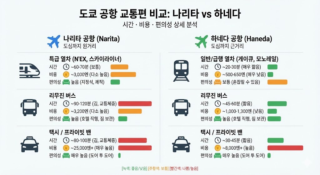 A. 하네다가 시내 접근이 빠른 편이지만, 항공권 가격/시간이 더 중요할 때도 많아요. 도착 시간/짐/숙소 위치 기준으로 선택하세요.