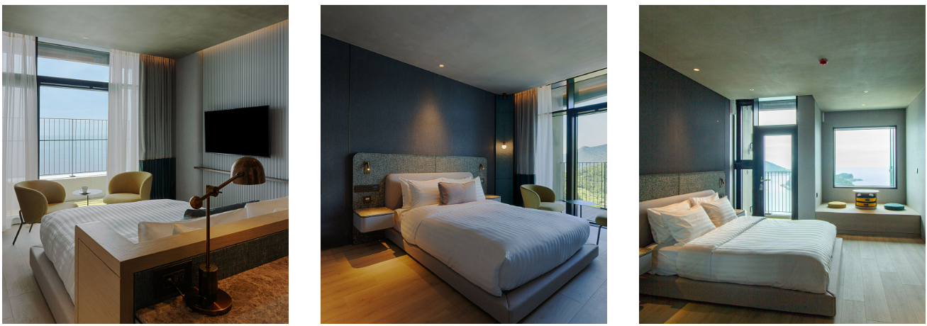 모든 객실은 전면 바다 전망(오션뷰)을 기본으로 설계되었고, 층고와 테라스 배치를 ‘남해 다랭이논’에서 영감 받아 층마다 바다 조망이 막히지 않도록 설계되었습니다.