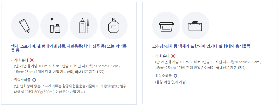 - 액체가 담긴 100ml이하의 용기가 1L이하의 투명 비닐봉투에 담겨 입구가 밀봉 된 경우 반입 가능 (투명 지퍼백 이용)