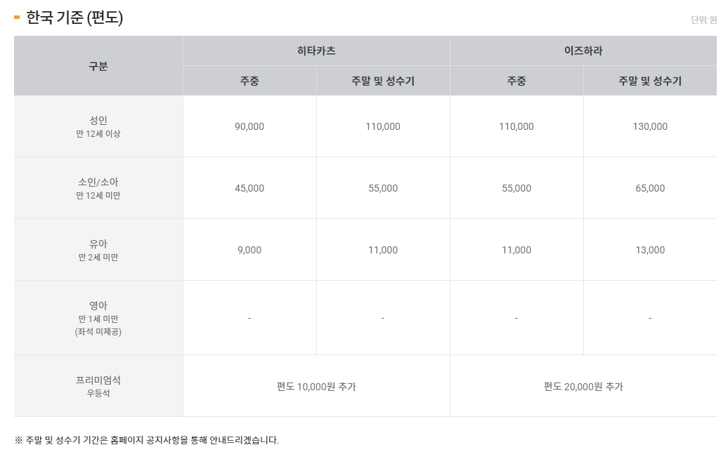 운임 외 별도금액 : 온라인 예약시 결제할 경우 탑승시점에 유류할증료가 인상되어도 차액을 징수하지 않으며, 인하되어도 환급되지 않습니다.