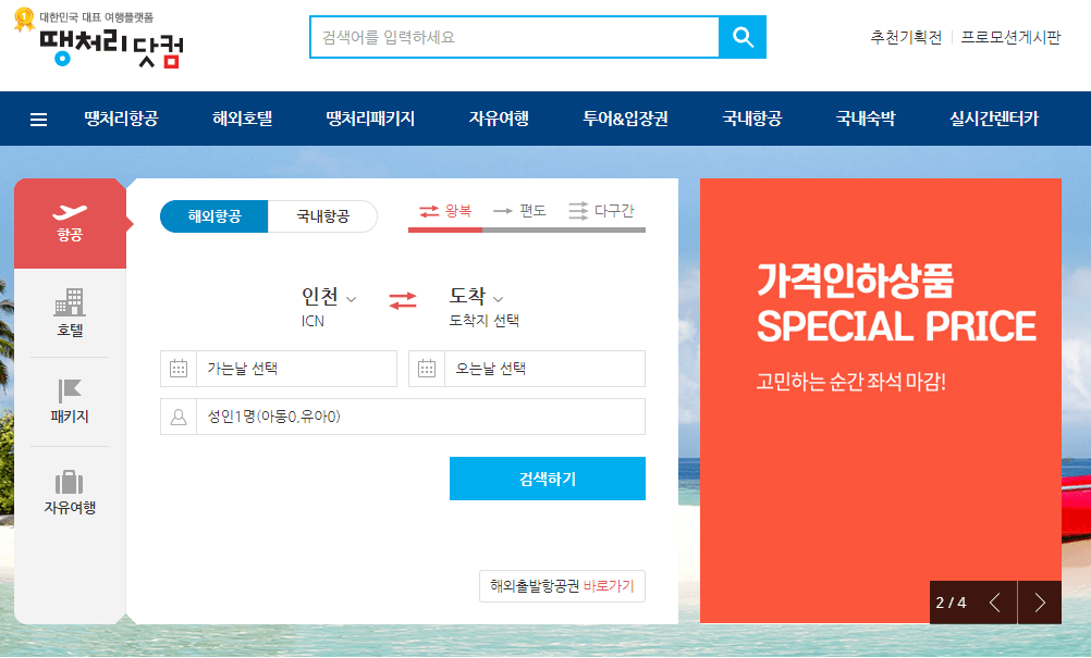 갑작스러운 휴가가 생겨 어디론가 여행을 떠나고 싶을 때, 이용하면 좋은 땡처리 닷컴의 땡처리 항공권, 패키지를 알아보겠습니다. 땡처리 항공권은 항공사가 마감 직전에 남은 좌석을 저렴한 가격에 일시적으로 판매하는 것을 말합니다. 잘 이용하면 항공편에 대한 경비를 절약하여 경제적인 여행을 즐길 수 있는 커다란 장점이 있답니다.