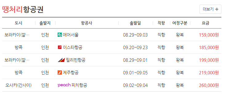 여행지, 출발일, 출발시간 등 미확정으로 고민중일 경우 땡처리항공권 더 보기를 눌러주세요. 땡처리항공권을 국가, 도시별로 검색 할 수 있어 원하는 국가, 지역의 항공권을 가격별로 알아볼 수 있습니다.