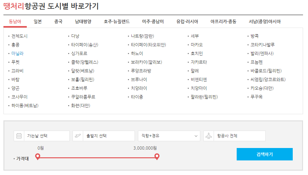 여행일정, 시간, 여행지가 정해진 경우에는 땡처리 닷컴에서 땡처리항공권 빠른 검색을 하면, 쉽게 땡처리 항공권의 가격을 확인할 수 있습니다