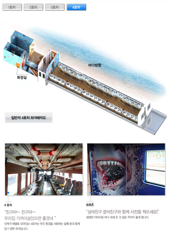 | 4호차(42석) | 단체석 배열로 되어있어 많은 친구와 또는 일행과 함께 하는 여행 |