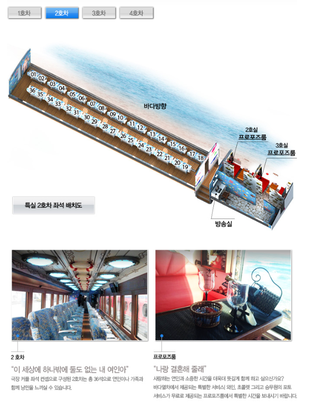 | 2호차(36석) | 사랑이 가득한 2호차는 극장의 커플좌석으로 연인이나 부부 사이의 고객에게 잘 어울리는 객실 |