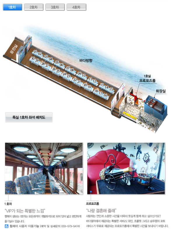 | 1호차(30석) | 행복이 샘솟는 1호차는 모든 좌석이 개별좌석으로 되어 있어 넓고 편안 |