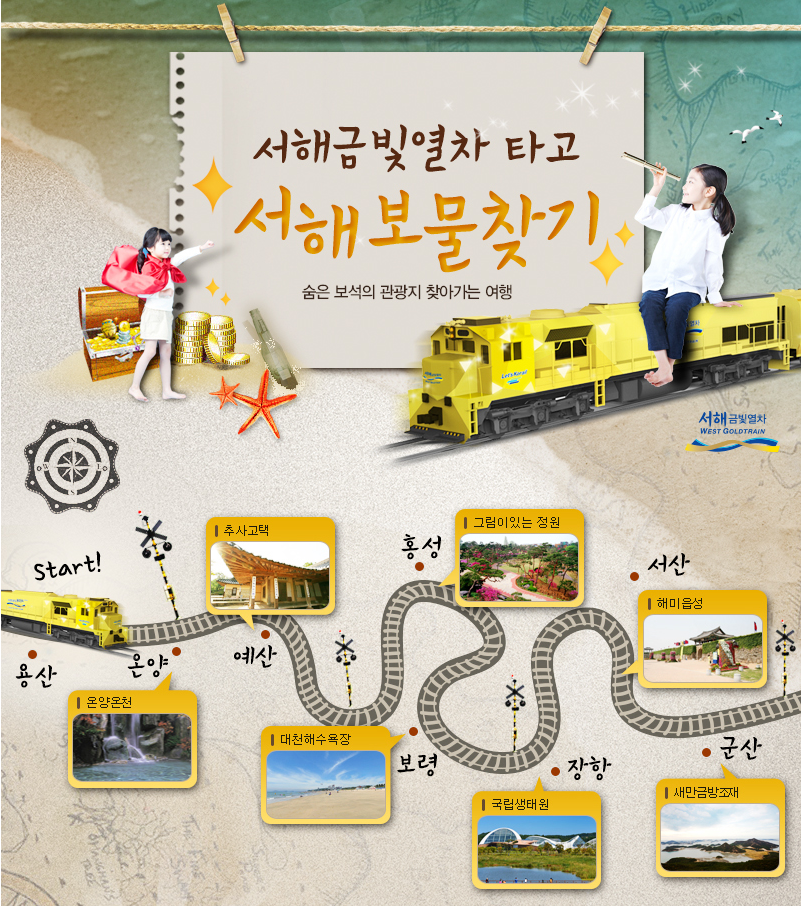 반짝이는 보석 같은 서해의 관광지를 찾아 떠나는 여행 더 늦기 전에 서해 금빛열차 예매로 준비해 보세요. 사랑하는 이들과 함께 많은 추억 만드시길 바랍니다.!!!