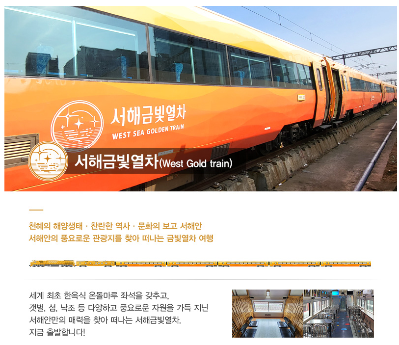 세계 최초 한옥식 온돌마루 좌석이 있는 서해 금빛열차를 아시나요? 서해안의 갯벌, 섬, 낙조 등 다양한 자연을 만날 수 있는 여행에 시작은 서해 금빛열차 예약으로 시작해 보세요. 서해 금빛열차가 인기인만큼 예약 경재도 치열하니 서해 여행계획이 있으시다면 서둘러 예약해 보세요.