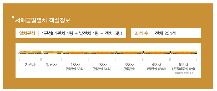 서해 금빛열차는 잔잔하게 일렁이는 서해 바다의 물결과 눈부시게 반짝이며 지는 석양을 모티브로 그래픽 패턴이 적용된 기차로 3량의 일반실과 1량의 힐링실, 그리고 1량의 온돌마루실로 구성된 5량의 기차입니다.