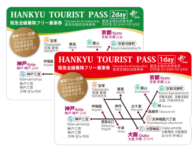 | 한큐 투어리스트 패스 | 오사카, 고베, 교토 | - 한큐 전 노선 이용 가능 - 비연속 사용 가능 - 오사카, 고베, 교토를 자유롭게 여행 가능 |
