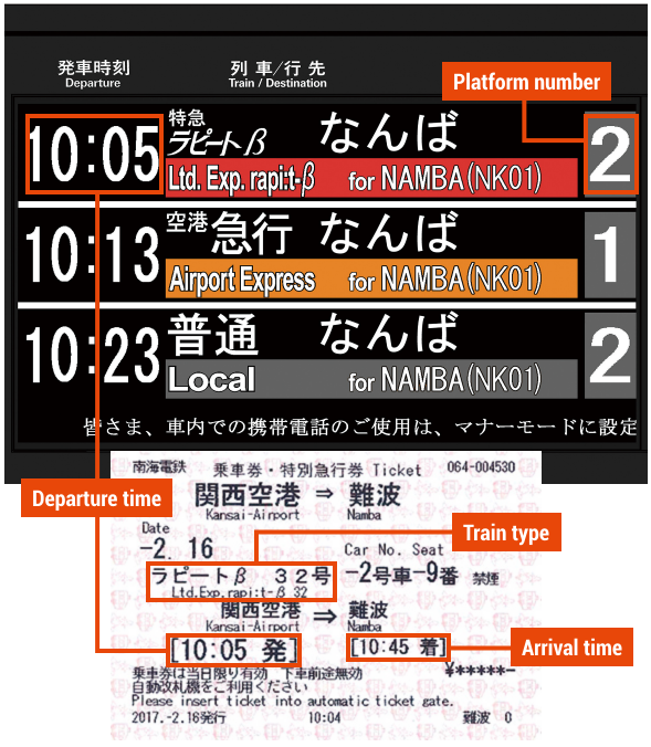 특급 라피트의 경우 간사이공항에서 난바를 최속 34분에 이동 가능하며 라피트알파(α)와 라피트베타(β)로 나뉘며, 라피트베타(β)가 기시와다역과 사카이역을 정차하여 조금 더 느립니다.
