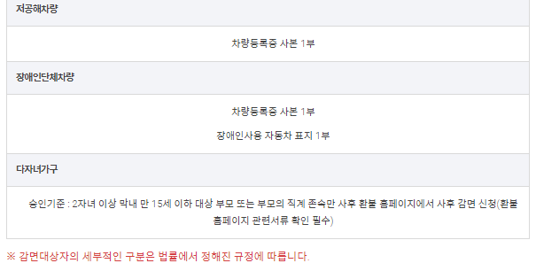 - 대상: 경차, 장애인, 국가유공자, 다자녀, 친환경 자동차 1종, 2종
