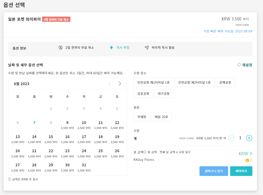 kkday 사이트에서 원하는 날짜, 데이터, 일수, 수령장소를 선택 후 이용하실 수 있습니다.