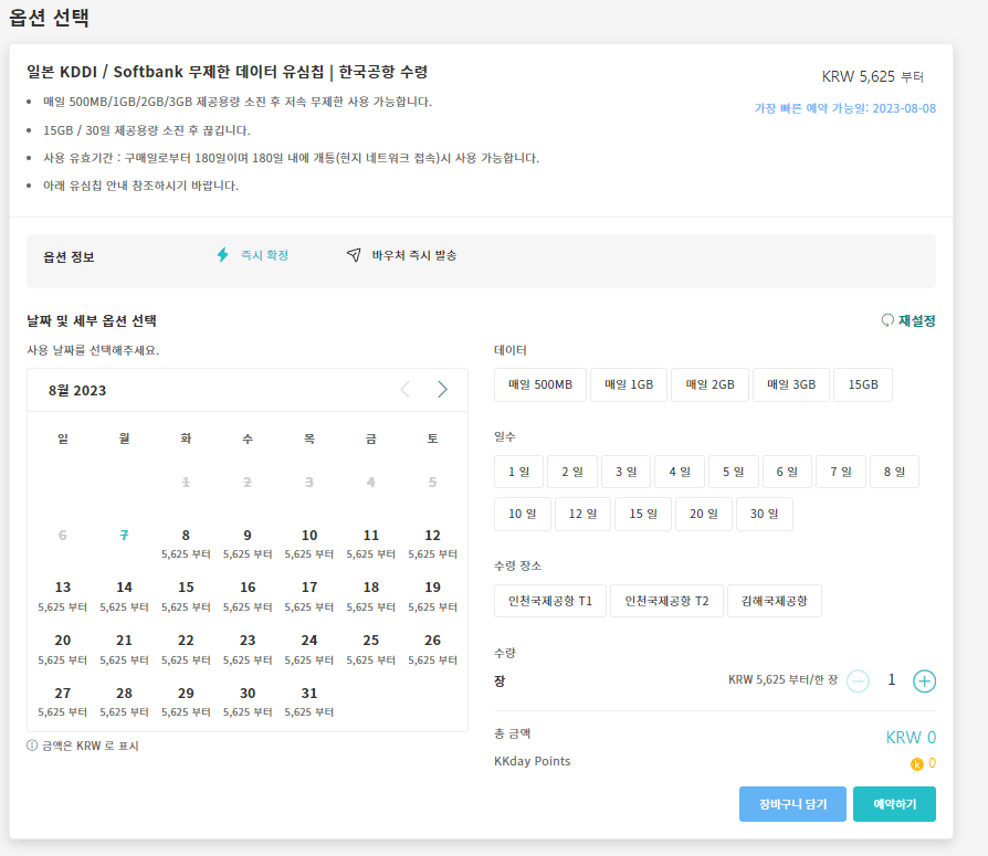 kkday 사이트에서 원하는 날짜, 데이터, 일수, 수량 선택 후 이용하실 수 있습니다.