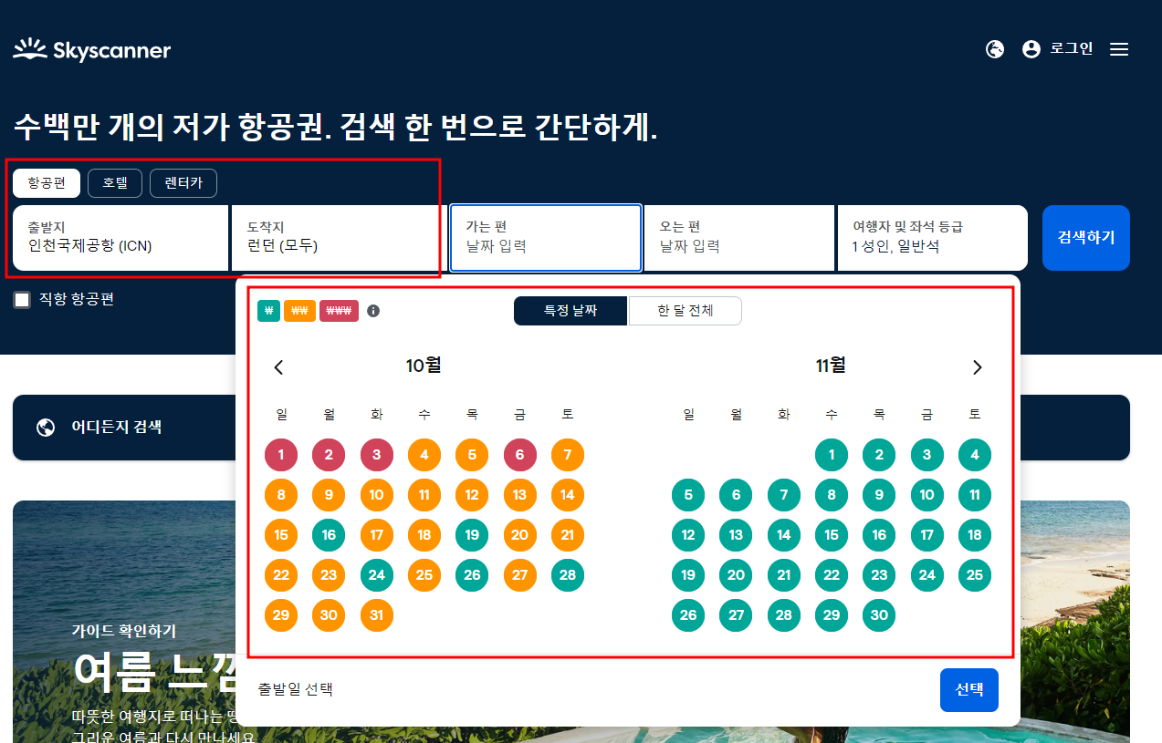 스카이스캐너 출발지와 도착지 선택 후 가는 편, 오는 편 검색 시 아래 사진처럼 색상으로 저렴한 날짜 확인 가능합니다.