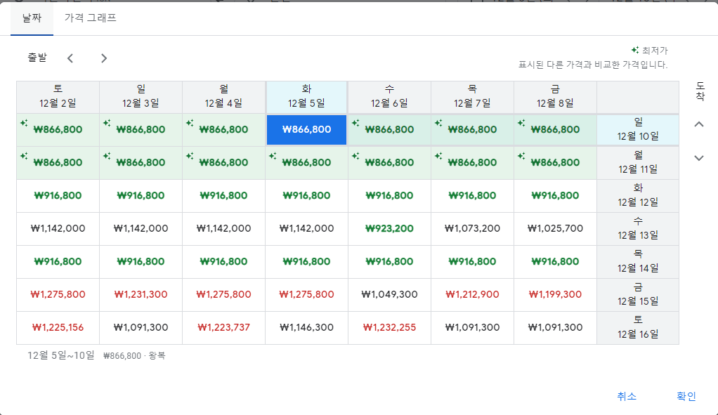 구글에서 항공권 검색 시 출발지, 도착지, 가는 날, 오는 날을 선택하고 검색 시 날짜표와 가격그래프로 좀더 저렴한 가격 대을 찾을 수 있습니다.