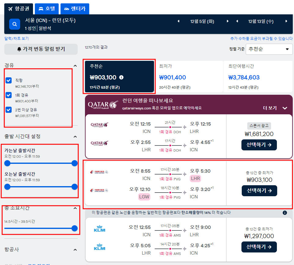 경유, 출발시간, 도착시간, 항공사 등 원하는 필터를 적용하면 원하는 항공권 찾기가 조금 더 편합니다.
